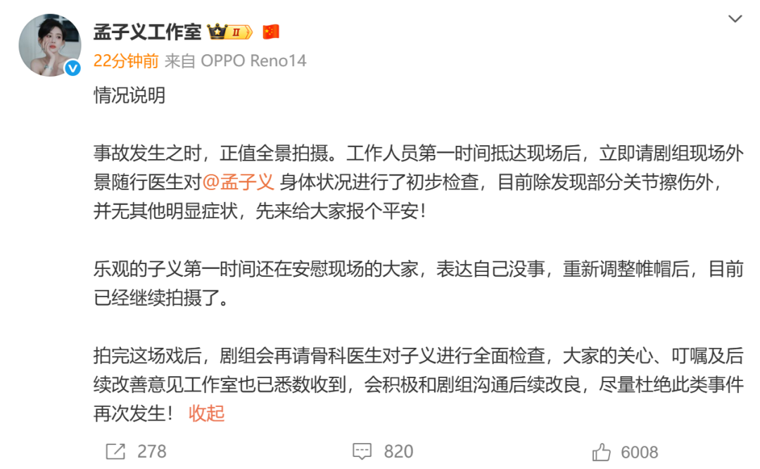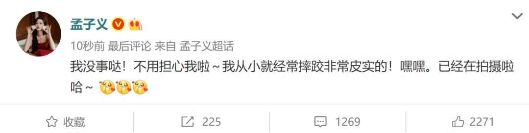 孟子义本人发文报平安:我没事哒!不用担心我啦~我从小就经常摔跤非常皮实的!嘿嘿。已经在拍摄啦哈~
