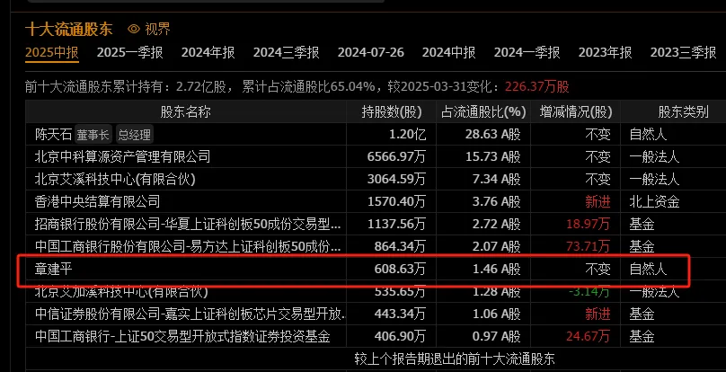 2024年四季度,章建平进入寒武纪前十大股东之列,彼时持股数量为533.88万股。2025年一季度,章建平增持了74.75万股。