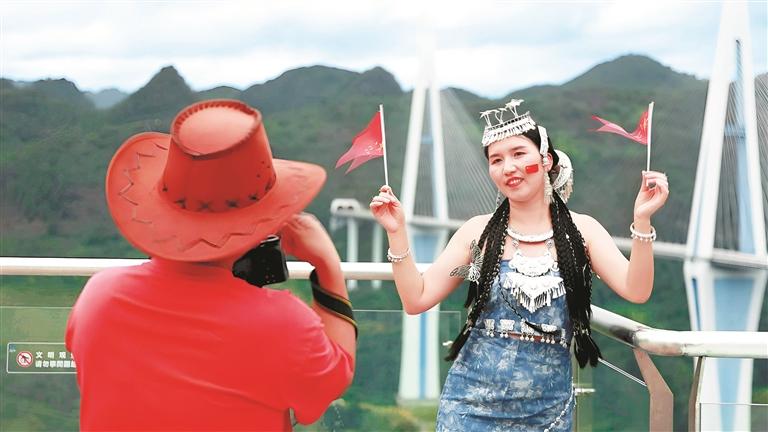 游客与“天空之桥”拍照留念。 肖影 何明珠 摄